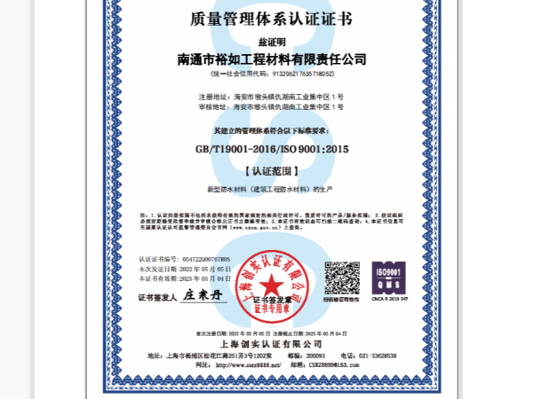 裕如防水獲得ISO9001質(zhì)量體系認(rèn)證